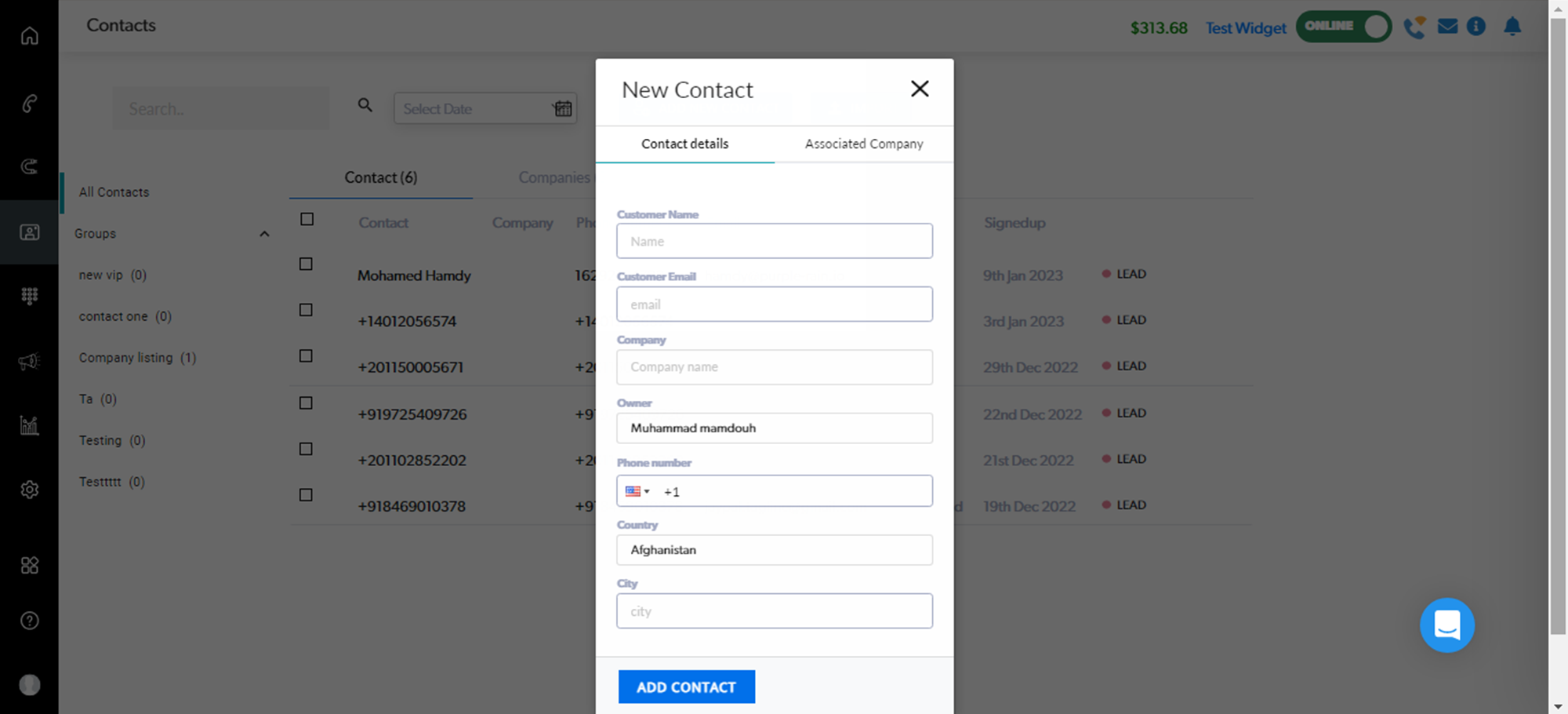To add contact information to [Contacts](https://platform.limecall.com/contacts)