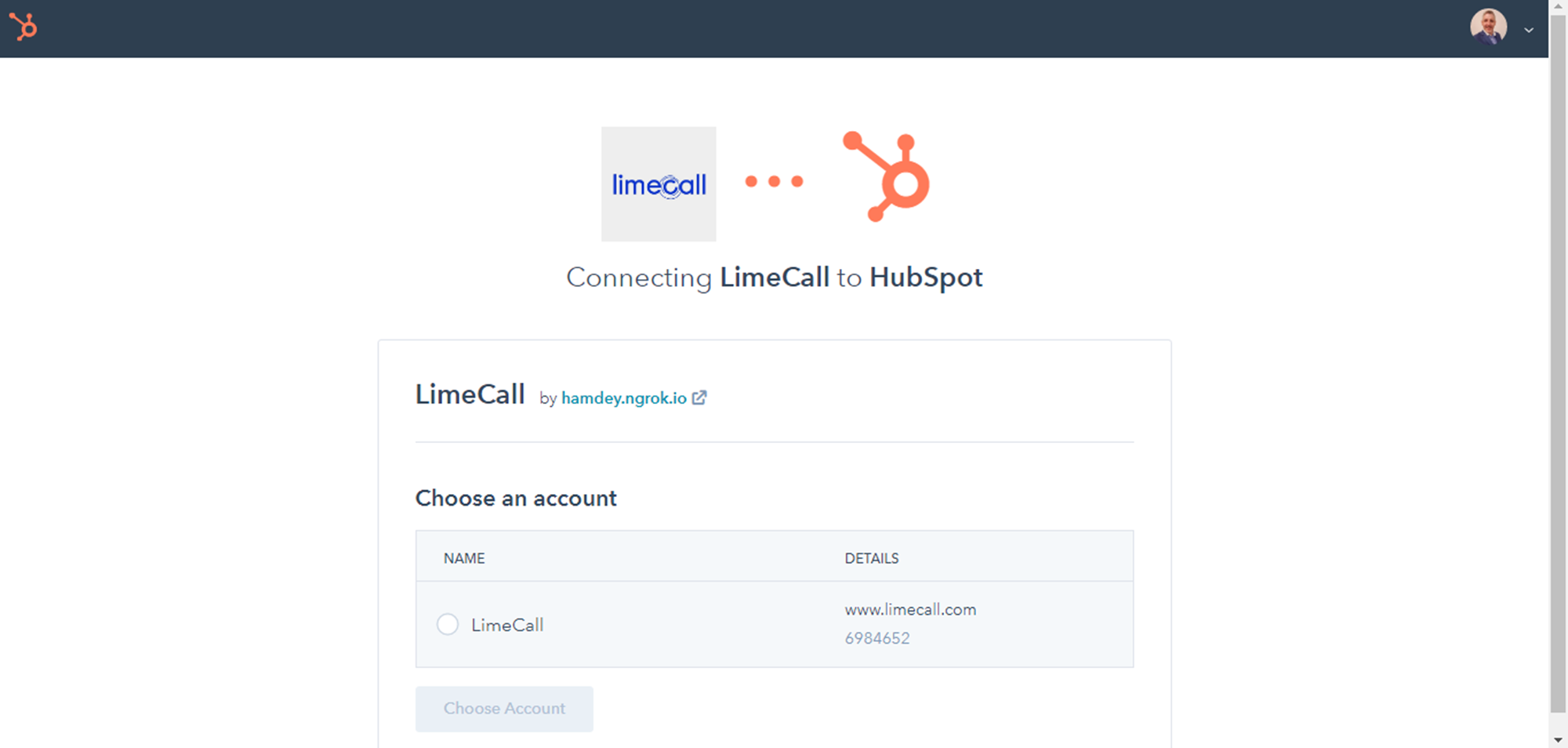 Select which HubSpot account you would like to integrate with, and accept the permissions to allow LimeCall to send and receive data to and from your HubSpot account.