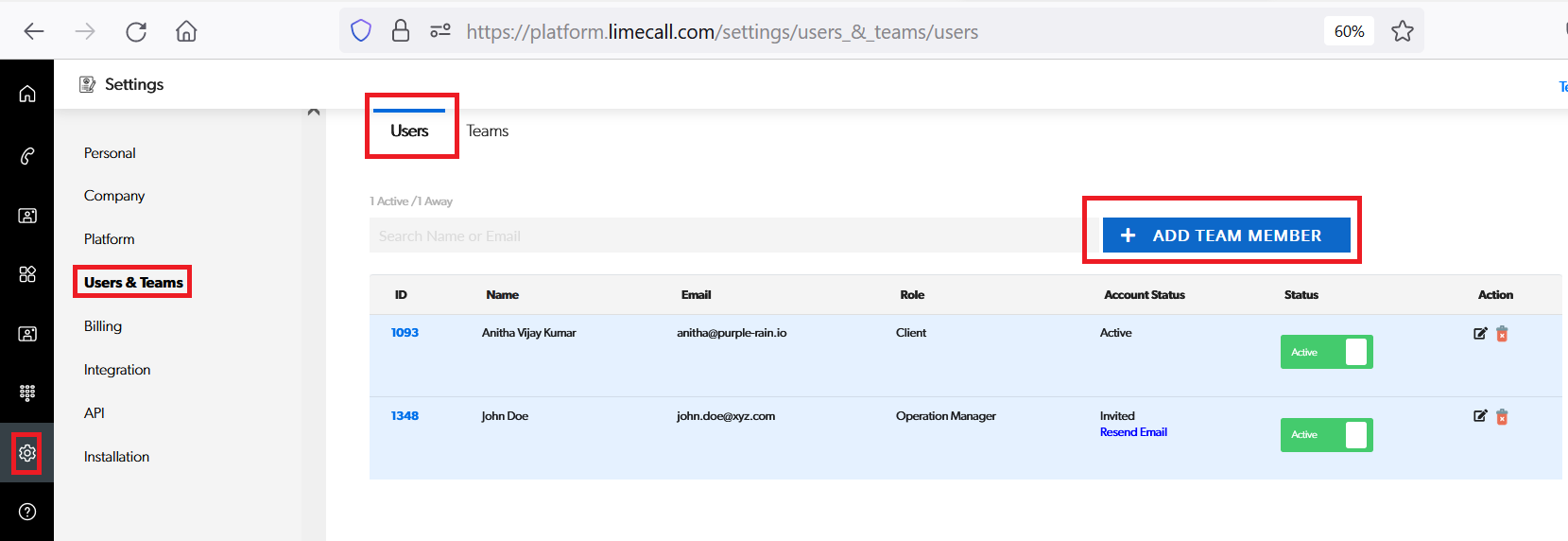 Settings > Users & Teams > Users