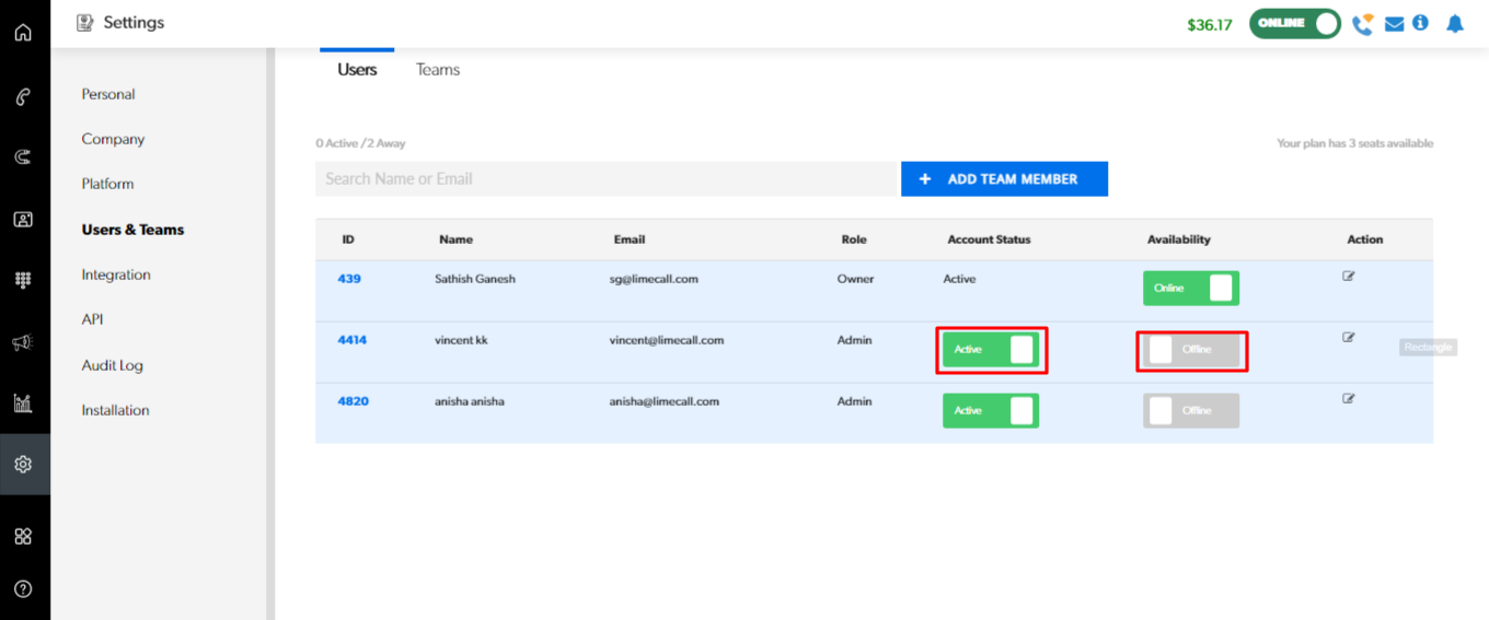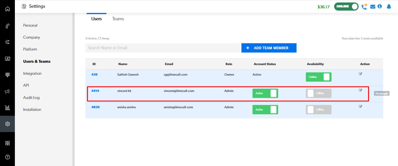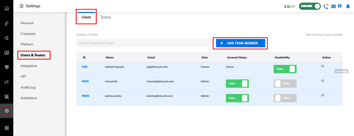 Go to [Settings > Users & Teams](https://platform.limecall.com/settings/users)