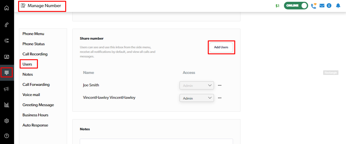 Go to Manage Number > Add Users