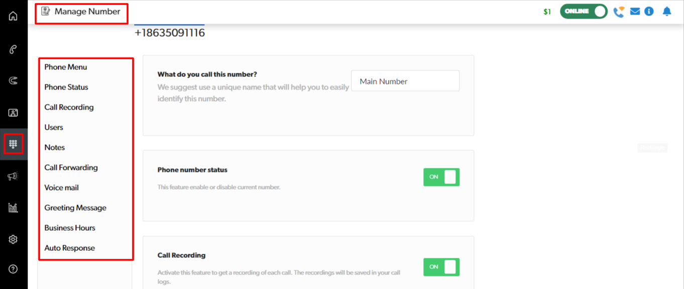 Configure all aspects of your virtual number with simple clicks including: