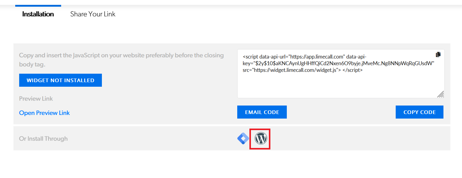 To do this go to LimeCall [Homepage > Settings > Installation](https://platform.limecall.com/settings/installation/installation) and Click on the Code and copy.