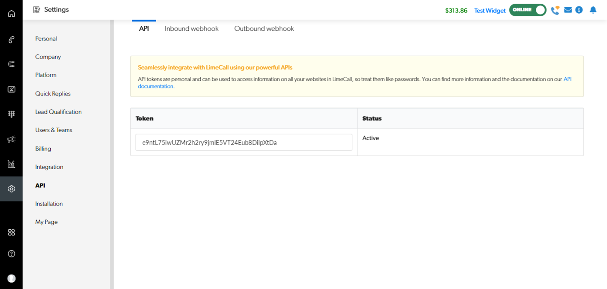 You may access the LimeCall API token via Settings > API